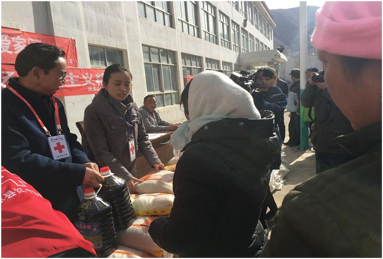 在发放仪式上,市红会与县红会有关领导为50户贫困藏族同胞发放米、面、食用油等生活慰问物资,共计发放慰问物资大米1000斤、面粉1000斤和食用油500升,价值11480元,活动中还为过往的群众发放了红十字会宣传资料100余册。